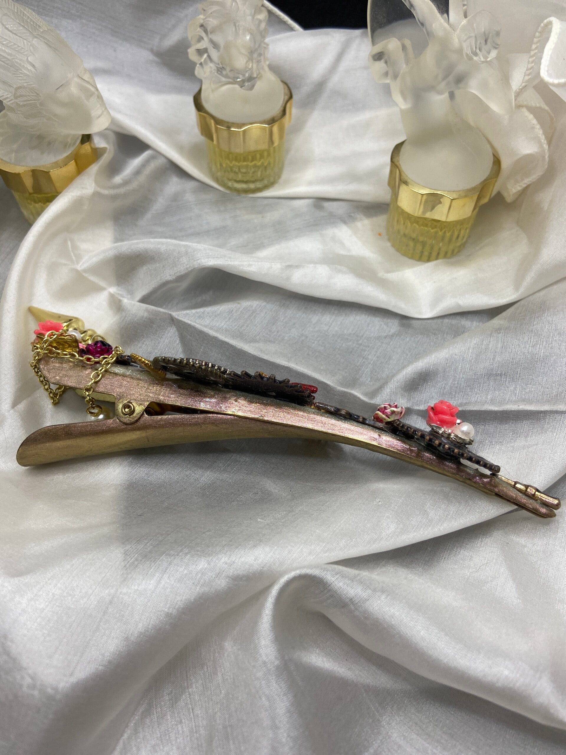 Pince à cheveux faite main thème du temps qui passe avec un pendule.