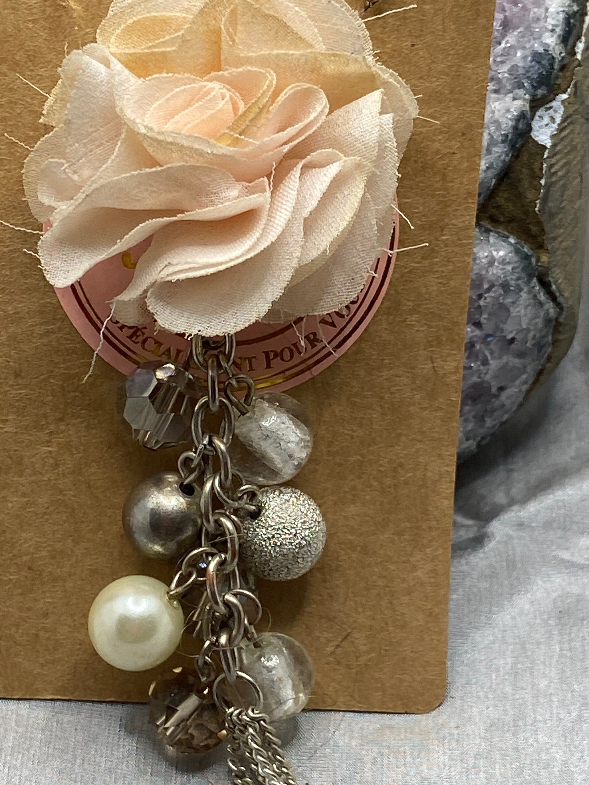 Sautoir bohème fleur tissus saumon chaîne argent avec des perles