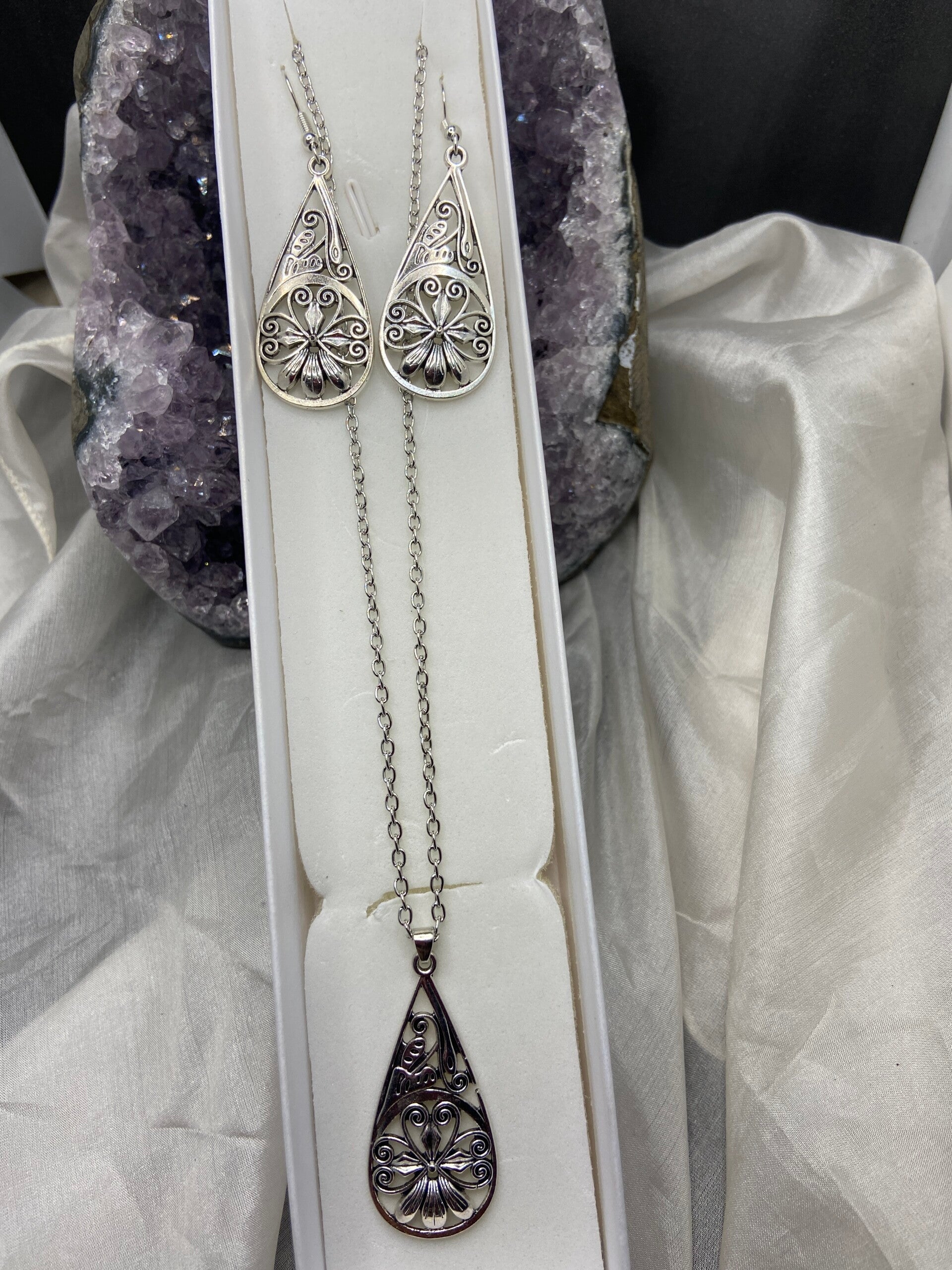 Ensemble collier et boucles assorties forme gouttes en argent.