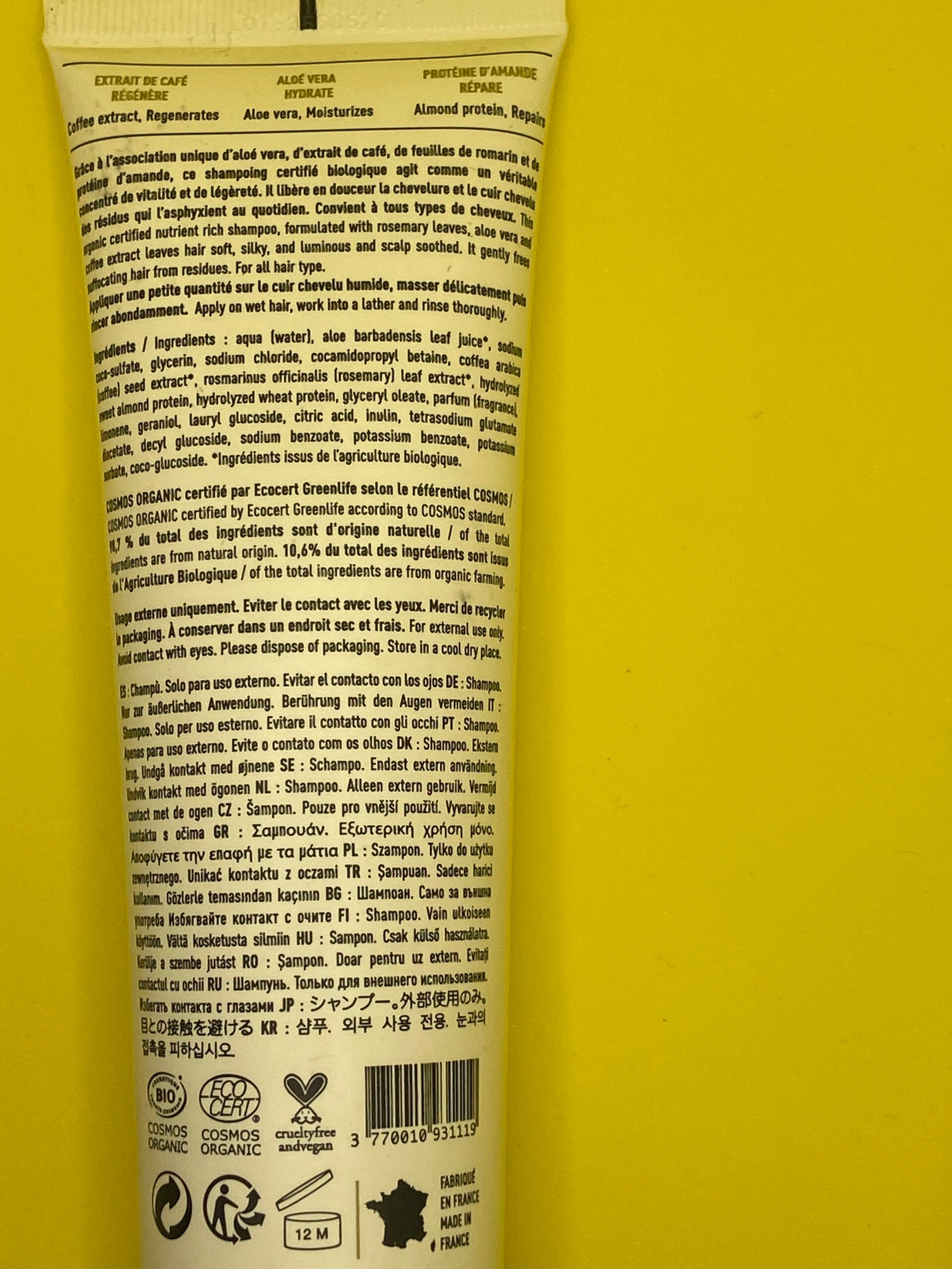 grâce À l' Association unique d'aloe vera d'extrait de café, de feuilles, de romarin et de protéines d'amande. ce shampooing certifié biologique agit comme un véritable concentré de vitalité et de légèreté.