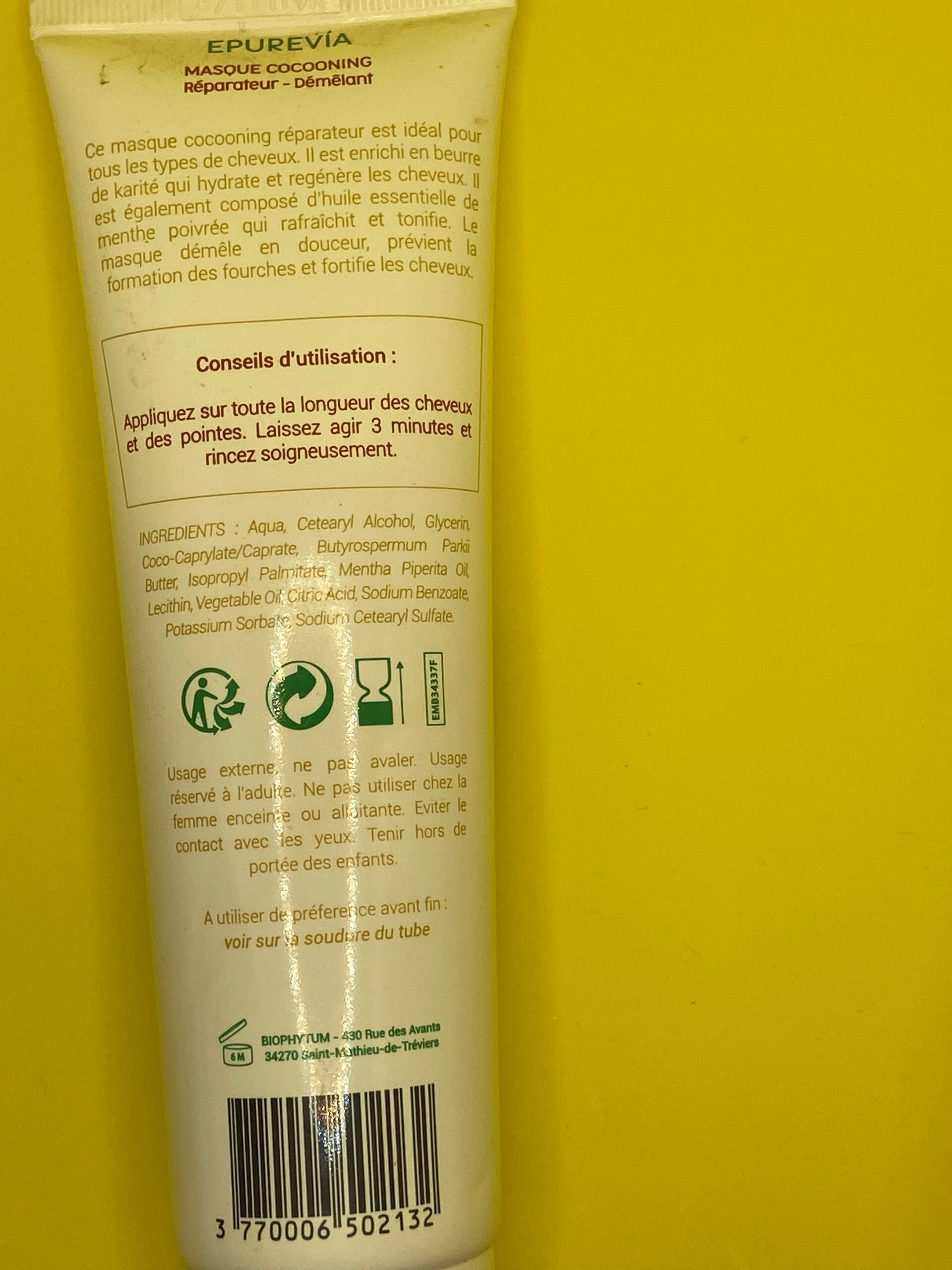 Masque, cocooning, réparateur, démêlant de la marque EPUREVIA Beurre de karité, ingrédients d'origine naturelle, ce Maskey cocooning réparateur, est idéal pour tous les types De cheveux, il est enrichi en beurre de karité qui me gratte régénère mes cheveux également composés d'huile essentielle de manche, poivrée qui rafraîchit et tonifie, il prévient la formation des fourches et fortifie les cheveux.