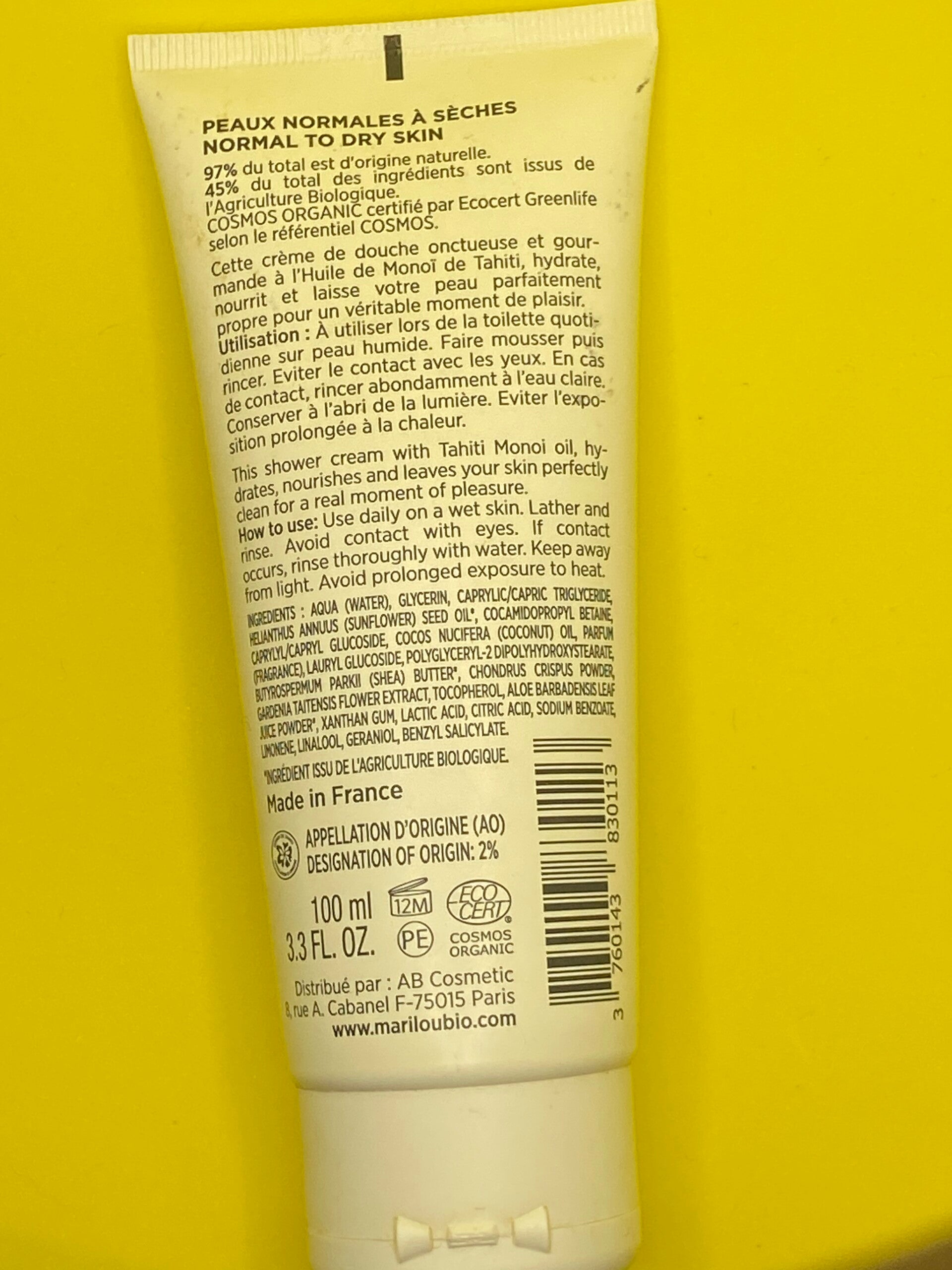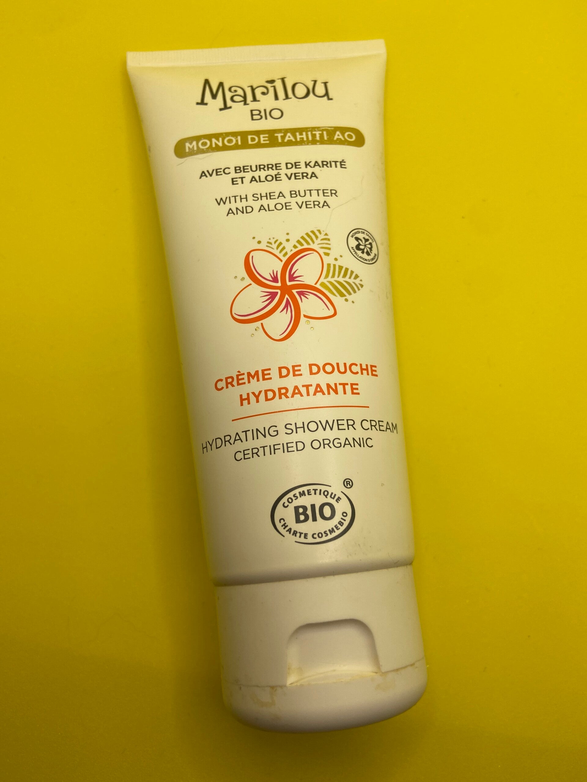 Crème de douche, hydratante Monod de Tahiti AO AVEC BEURRE DE KARITÉ ET ALOE VERA. Peau normal a sèche. Cette crème de douche onctueuse est gourmande à l'huile de monoï de Tahiti, hydrate, Noé Inès, votre peau, parfaitement propre pour un véritable moment de plaisir.