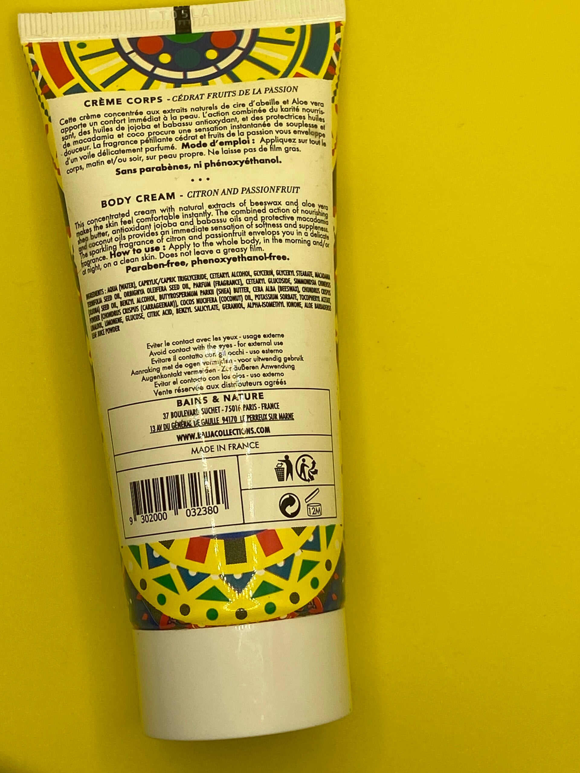 Crème pour le corps, concentré aux extraits naturels de cire d'abeille et d' aloe vera, apporte un confort immédiat à la peau, l'action combiné du karité nourrissant, des huiles de jojoba et babassu antioxydant et des protectrices, huiles de macodamia et coco, procure une sensation instantanée, de souplesse et de douceur. La Fragance pétillante cédrat Et fruit de la passion, vous enveloppe d'un voile délicatement parfumé sans parabènes, ni phénoxyéthanol.